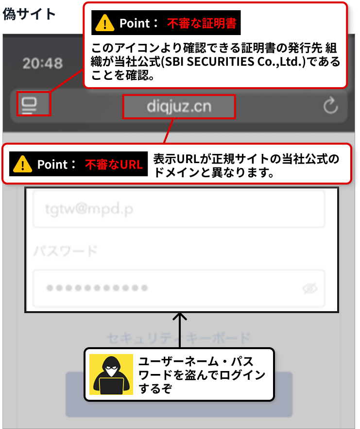 ブラウザの証明書の「発行先 組織」が、当社公式(SBI SECURITIES Co.,Ltd.)かを確認してください。