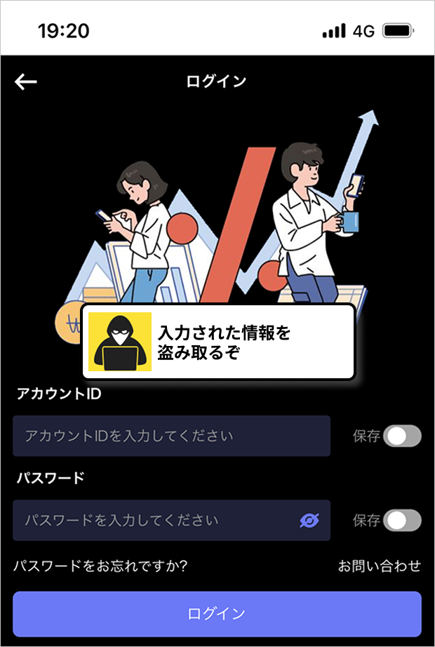 偽サイトで、ユーザーにID・パスワードの入力を促します。
